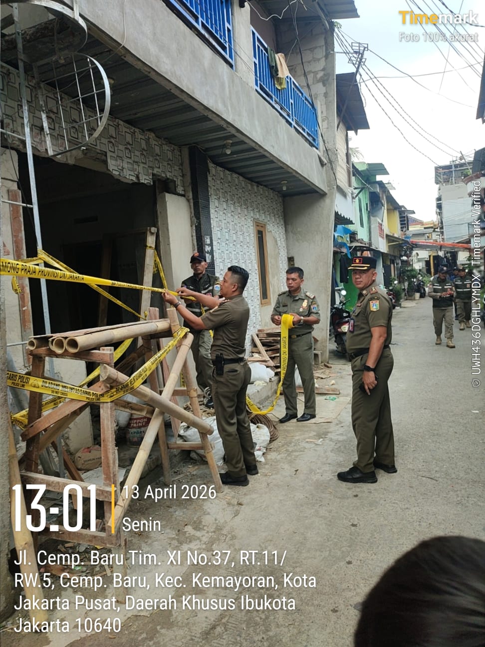 Satpol PP Kecamatan Kemayoran memasang garis polisi (police line) di lokasi sebagai langkah tegas penegakan Peraturan Daerah (Perda), khususnya terkait kewajiban Persetujuan Bangunan Gedung (PBG).