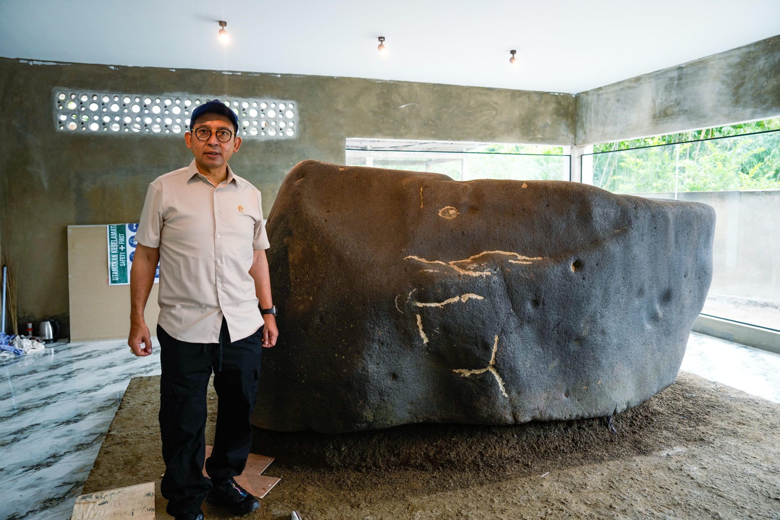 Bogor, satunasional –Menteri Kebudayaan RI Fadli Zon meninjau langsung proses relokasi Prasasti Muara Cianten yang berada di Desa Ciaruteun Ilir, Kecamatan Cibungbulang, Kabupaten Bogor, Selasa (20/1).